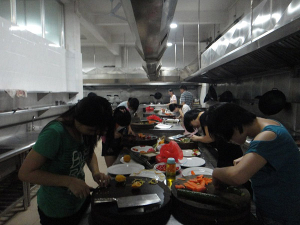 今天水果围边小组的同学来得比较多,大多是11级的同学们。虽然是新手,但她们丝毫不示弱,在师兄师姐的教导下,她们慢慢领悟到怎样用刀去切出自己想要的造型和怎样把不同的蔬果摆出漂亮的围边图案。操作室里非常闷热,站在案板边上小心翼翼地摆弄着蔬果的她们,早已是汗流浃背了,可她们没有半句抱怨的话,只是默默地思考着如何把这份工作做好,偶尔才和旁边的同学交流一下,但很快又投入到自己手上的工作了。