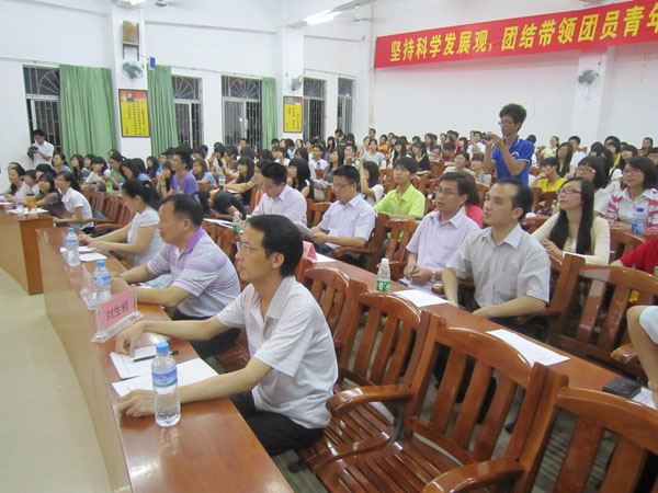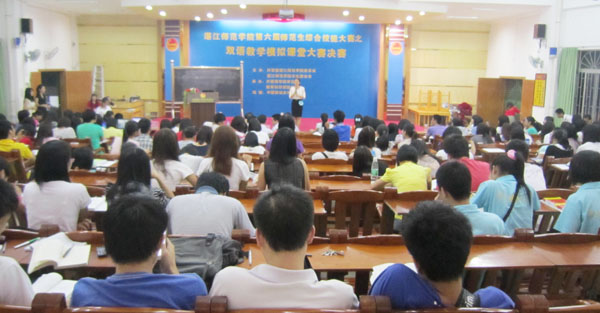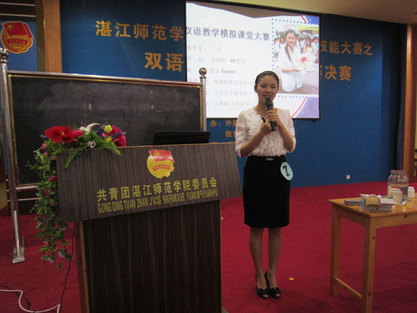 湛师新闻网4月25日讯 22日晚,由校团委及校学生会联合主办,外国语学院学生会及教育科学学院学生会承办的第六届师范生综合技能大赛之双语教学模拟课堂大赛决赛于弘雷楼311室举行。外语院曹志希教授、化学院刘生桂副教授及数科院段樱桃老师担任比赛评委。校团委李发武副书记、李亚九主任、梁剑老师,外语院辅导员陈理才老师及教科院辅导员邓倩文老师以及近400名双语教学爱好者参加了本次大赛。