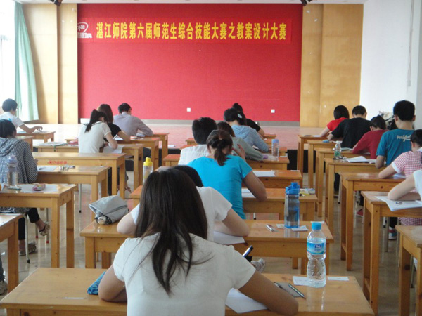 比赛规定,参赛者必须根据指定一课时(45分钟)的教学内容,利用教材现场设计教案一例。下午三时,比赛正式开始,现场十分安静,各位参赛同学埋头苦干,开始起自己的教案设计。半个多小时过去了,只见参赛者们在纸上唰唰地书写着,外界的声响并没有对他们造成影响。比赛持续着,没有一个人中途退赛,大家都在坚持着。最后比赛结束,所有参赛作品上交完毕,参赛者们陆续离场。
