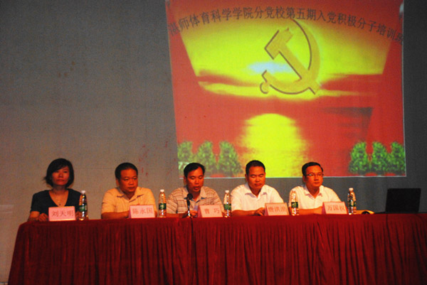 湛师新闻网4月23日 昨天上午,体科院分党校在音乐厅举行第五期入党积极分子培训班开班仪式,体科院党委曹巧书记、数科院党委唐洪浪副书记、继续教育学院副处级辅导员陈永国老师、化学院辅导员万国权老师以及体科院辅导员刘天明老师出席本次开班仪式。本期培训班共有体科院、化学院、数科院、继续学院等四个学院的470多名通过考试的同学参加了本期培训班。开班仪式由刘天明老师主持。