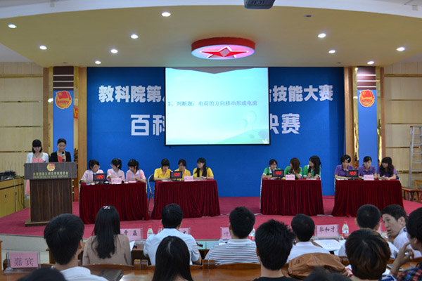 湛师新闻网4月23日 为进一步落实与加强教科院精神文明建设,鼓励学生通过“牢记知识要点、构建知识线索、扩展知识层面”学习知识、增长见识并提升素质,争当“百科型”人才, 昨天,教科院在弘雷楼311室举行第八届师范生综合技能比赛之百科知识竞赛决赛。科技处副处长谭荣波教授、思政处叶继海博士、教科院党委郭和才副书记担任了本次比赛的评委。此外,教科院党委王列盈书记,校主席团、各二级学院主席团代表,校宿管部以及各二级学院宿管部代表也出席了本次比赛。