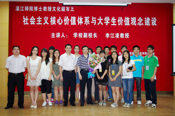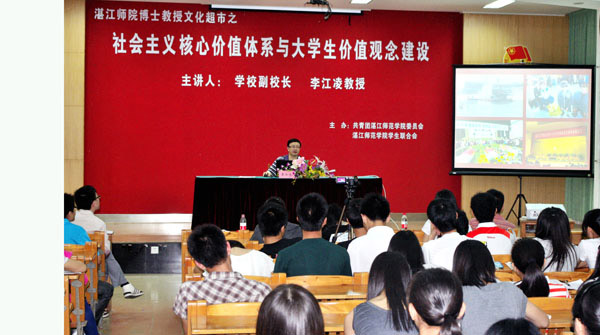 湛师新闻网4月22日讯 亲近学子,崇尚学术。4月18日晚,由校团委、校学生会联合主办的第50期教授博士“文化超市”在鸿园四楼学术报告厅举行,我校李江凌副院长受邀作了题为《社会主义核心价值体系与大学生价值观念建设》的学术讲座。校团委老师以及两百多名学子前来聆听讲座。