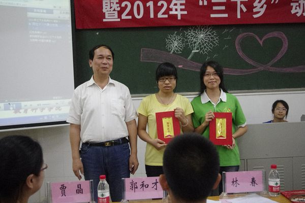 大会伊始,一段简短精彩的视频为同学们回顾了2011年暑期“三下乡”社会实践的温暖与感动。会上,魏珂老师作了学院2011年暑期“三下乡”社会实践工作。郑剑虹副院长宣读了《关于表彰教科院2011年暑期“三下乡”社会实践活动优秀实践队和先进个人的决定》,并由林春书记为优秀实践队颁奖,郑剑虹副院长、郭和才副书记为先进个人代表颁发奖项。随后,校社会实践“十佳队长”梁琳琳和校社会实践“先进个人”关惠优先后与有志于参加2012年“三下乡”的同学们分享了“三下乡”组织经验和个人心得。