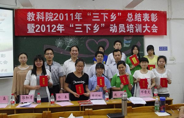 据悉,教科院2011年被团省委、省委宣传部、省文明办、省教育厅、省学联评为广东省大中专学生志愿者暑期“三下乡”社会实践活动先进单位。学院“幸福红领巾”服务队开展的“心手两相牵·同济互助行”的帮扶活动,以创新的策划和出色的服务赢得赞许,被载入团省委向省委、团中央汇报的“三下乡”工作简报之中。在新一年的“三下乡”社会实践工作中,教科院又突出地表现三个特点。一是谋划早。在二级学院中率先举办了2011年“三下乡”社会实践活动的动员大会。二是措施实。将动员与培训相结合,由学院主管科研的副院长亲自作“三下乡”培训指导,把大学生社会实践教育工作纳入学院人才培养和教学科研工作中通盘统筹。三是载体好。率先开通学院“三下乡”微博群,共享“三下乡”工作指南,及时、全面地掌握和发布各服务队的筹备及活动开展情况,也为全院“三下乡”志愿者提供了随时随地信息交流、互动、分享的网络平台,让全院同学实践服务的所感所想能快乐分享、交汇共鸣,形成氛围,凝聚合力。