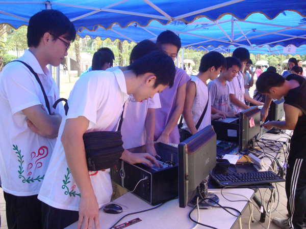 纵使五月的太阳已透出火辣的气息,电协理事仍专心致志,齐心协力检修每一台送到维修处的电脑,耐心解决各种电脑问题。在此次维修活动中,电脑协会设置了会员专区,为会员讲解简单的硬件知识,充分体现出其对会员负责的原则。同时,为了宣传“电子杂志制作比赛”,电脑协会还设置了我校“电子杂志制作大赛”咨询点。