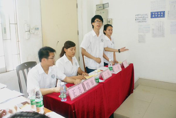 本次比赛共分三场展开。首先亮相的是11历史队和10历史队,他们围绕“城市化是否有利于人类的发展”展开一场激烈的争辩。正方11历史队坚信城市化能带动农村、环境、科技、文化等方面的发展并列举了新加坡等国家的城市化成果,反方10历史队则紧紧地扣着城市化对环境的污染、加剧了城市交通住房压力以及对人们价值观的不良影响等方面进行有力的反驳。双方都备战充分、武装充实,进攻猛烈,辩驳有力。雄辩的口才在激辩的在双方都体现地淋漓尽致。