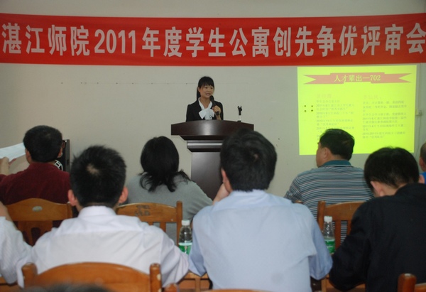 湛师新闻网4月11日讯 4月9日下午,2011年度学生公寓创先争优评审会在尚德苑文化活动室举行。学生处钟莉萍副处长,各二级学院学工办副主任及辅导员,学生公寓管理中心四位主任与苑区主管老师参加了评审会。
