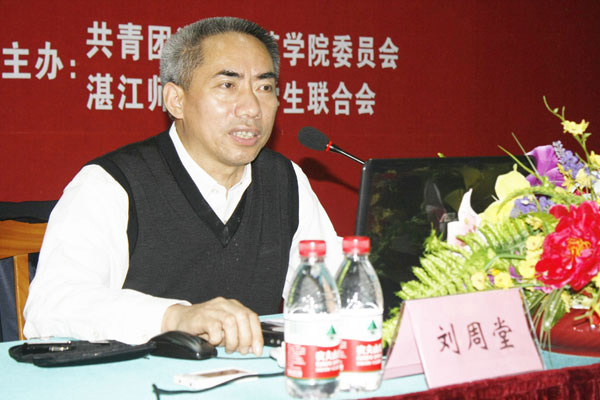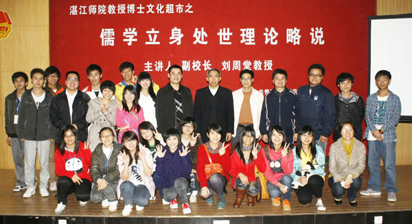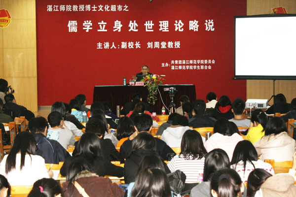 湛师新闻网4月1日讯 亲近学子,崇尚学术。近日,由校团委、学生会主办的第四十五场教授博士“文化超市”讲座在鸿园四楼学术报告厅举行,我校副院长刘周堂教授受邀主讲了题为《儒学立身处世理论略说》的学术讲座。校团委李粤书记、李发武副书记、粱剑老师参加了本次讲座,讲座历时三个多小时,现场人潮涌动,气氛热烈。