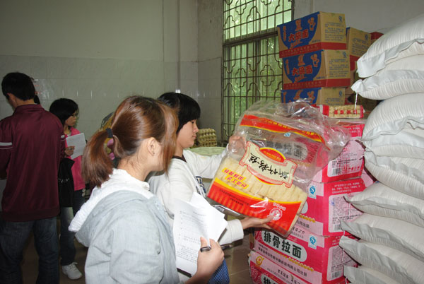 活动前,校权益部干部分别给学生代表分发各食堂的内务卫生检查表,检查表主要针对各食堂的地面、餐具、垃圾处理、食品质量等方面进行检查。活动开始,监察小组首先进入食堂低楼层的洗消间。在洗消间中,监察小组就餐具的清洗和消毒过程认真询问相关食堂负责人,并相应在检查表中填写分数和相关建议。接着,同学们来到主食仓,监察小组即时对大米、面粉等主食的保质日期和来源进行了提问。校饮食中心吕冬副经理当场出示了食品采购表,并展示了采购日期、生产地和厂商的联系方式。在副食仓,监察小组针对最近潮湿多变的天气提出“如何保证副食不受潮”等问题。食堂负责人一一作了回答。随后,监察小组依次到了食堂各楼层的加工间、点心部和烹饪间察看了卫生等情况。期间,同学们都认真作了相关的记录,并向负责人提出自己的意见和建议。