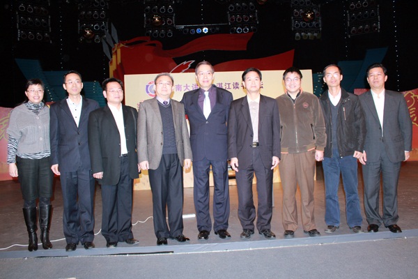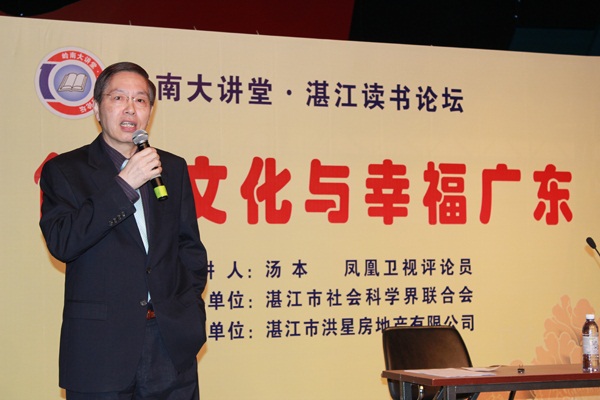 湛师新闻网3月25日讯 昨日上午,湛江电视台演播中心举办了由美国著名华人学者、凤凰卫视著名评论员汤本教授主讲的专题学术讲座——《创意文化与幸福广东》。本次活动由湛江市社会科学界联合会主办,我校人文学院谢应明书记、新闻系姚远主任、詹绍姬老师以及新闻系的同学们应邀参加了本次讲座。
