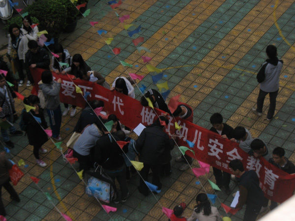 随后,同学们在幼儿园门前给每位家长发放安全教育宣传单。孩子们在家长的带领下,一起在安全教育横幅上签名。