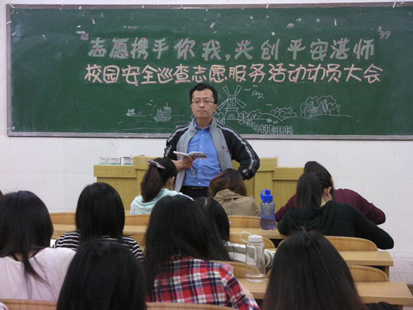最后,邓老师围绕校园志愿者巡查活动展开详细讲话。针对近期频频发生的校园安全事故,校团委与校治安服务队策划了“校园安全巡查志愿服务活动”,邓老师表示对此举大为赞赏,并呼吁同学积极参加。邓老师提到,身为大学生要有互助奉献精神,要“向远处看,向近处做”,学雷锋从现在开始,从身边开始。为学校出力,共同建设和谐校园,是身为当代大学生必备素质之一。所谓“千斤担子万人挑”,“众人拾柴火焰高”,邓老师希望同学们能以此激励自己。