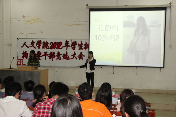 湛师新闻网3月19日讯 昨晚,人文学院在弘雷楼611教室举行了第九届学生机构主要干部竞选大会。人文学院党委谢应明书记,冯基聪副书记以及辅导员詹绍姬、陈明辉、黄河等老师出席了大会。