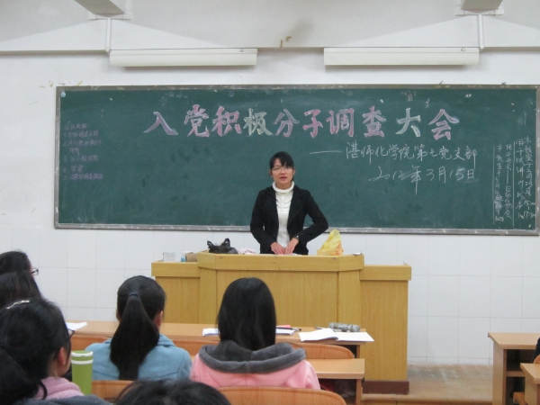湛师新闻网3月16日讯 昨晚,化学院第七学生党支部在燕雷楼212举行了入党积极分子调查会议,出席本次会议的有化学院党建负责人叶金燕同学、第七学生党支部书记陈东菊同学、副书记柯冬晓同学以及化学院09级化本1、2团支部、10级化本1、2团支部等80名调查对象。