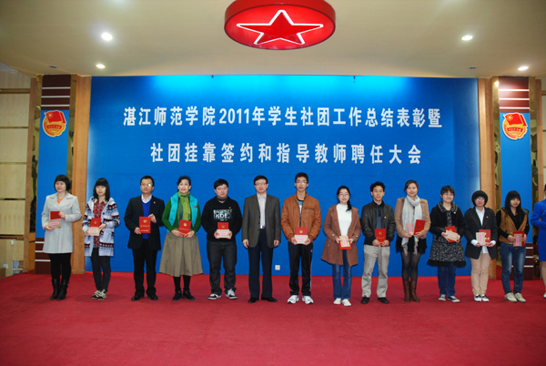 湛师新闻网3月12日讯 昨天,我校2011年社团工作总结表彰暨社团挂靠签约和指导教师聘任大会在弘雷楼311室举行。我校李江凌副院长、校团委全体老师、二级学院辅导员、各社团指导老师以及社团代表参加了大会。大会由校团委李发武副书记主持。