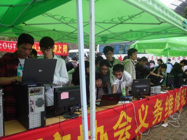 场地的布置完毕后,义务维修活动于早上8:00准时开始了。活动过程中,电脑协会的理事们耐心地解答同学的各种电脑问题,全神贯注地检修各台电脑。在这次维修中,电脑问题主要是回潮使得主机开不了以及客户端连接不良。