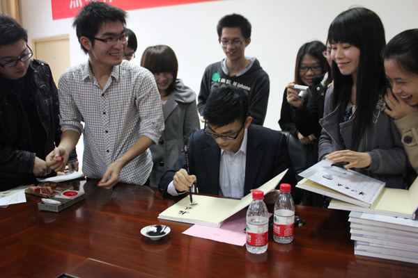 最后,黄达海处长对本次座谈会作总结。他希望书法协会多举办类似的有意义的活动,让书法爱好者以交流的形式互相学习,互相影响,并在分享中学习,在学习中分享。此外,为了让同学们对书法的产生共鸣、学会更好地鉴赏书法作品,黄达海处长建议同学们多读书、多临帖、下苦功,才能有收获。会议的尾声,黄达海处长还给本届书法大赛的获奖者代表赠送他的新书《等你爱我》,并签字留念。