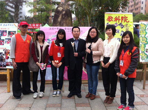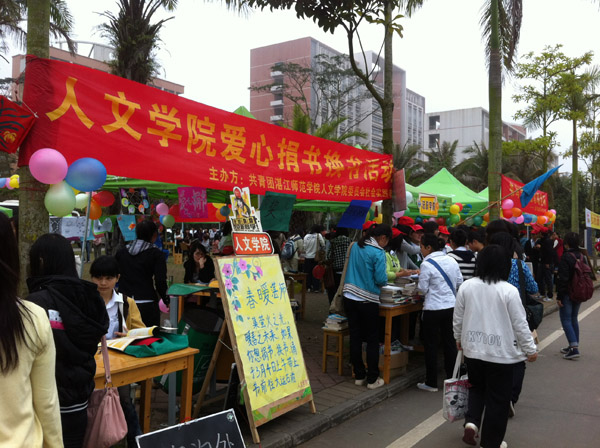 人文学院爱心捐书换书的活动现场也是人头攒动,爱心满满。据了解,在活动前夕,该院干部积极宣传此项活动,不仅学生,学院领导老师也加入到此项活动中。而由09中本1团支部举行的以“让爱传递,感恩图报”为主题的活动也吸引着大家的眼球,旨在告诉大家食堂保洁员的辛勤劳动,大家应当要珍惜清他们的劳动成果。另外,活动现场该院志愿者为同学们讲解以“三爱一奉献”为主题的“人文学院志愿者风采展”相关内容,向大家传达人文学子的人文关怀,提升人文素质。