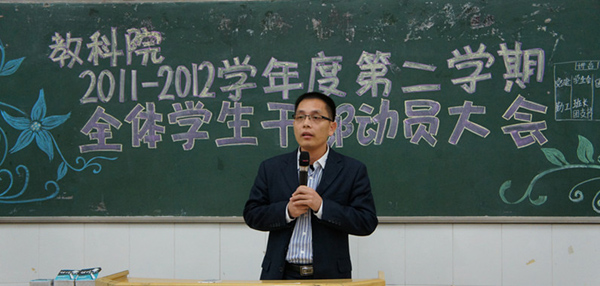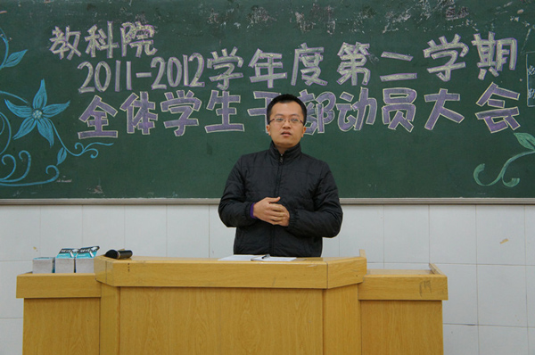 湛师新闻网2月27日讯 昨晚,教科院于燕雷楼105教室举行2011——2012学年度第二学期全体学生干部大会。教科院党委郭和才副书记,辅导员邓倩文、魏柯、卢祖琴、贾晶老师以及全体院干出席了本次大会。