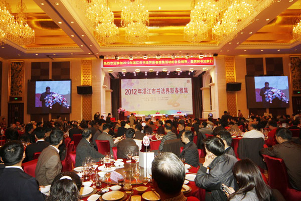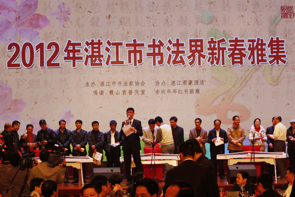 湛师新闻网2月8日讯 2月4日上午,春回大地,万象更新。由湛江市书法家协会主办的“2012年湛江市书法界新春雅集”在湛江君豪酒店举行。广东省文联党组成员、专职副主席刘小毅,市政府常务副市长、党组副书记、市公安局局长张荣辉,副市长罗锡平,市政协副主席黄雪艳等,市书协主席团成员、市、各县(市、区)艺术界等360人欢聚一堂,参加了这次活动。活动由市书协秘书长、我校学生处长黄达海主持。