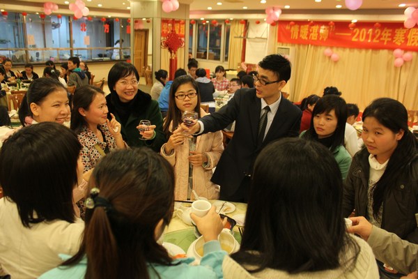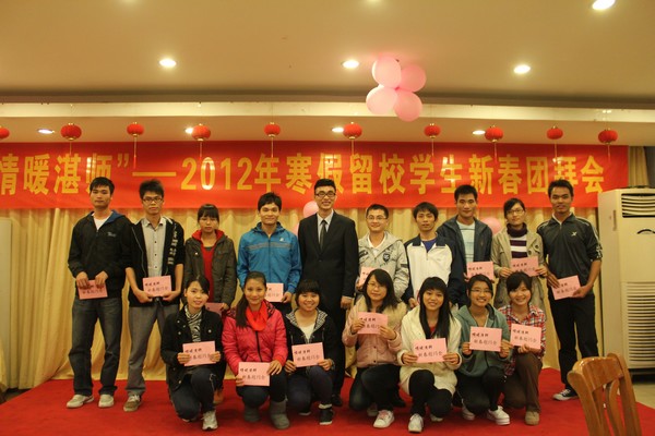 湛师新闻网1月22日讯 师生一家亲,共度欢乐年。昨晚,由学生处主办的“情暖湛师”——2012年寒假留校学生新春团拜会在圆府酒店举行。学生处黄达海处长、钟莉萍副处长、学贷中心谢巧云主任、部分二级学院副书记以及勤工中心老师与100多名留校学生一起共享团圆饭,共庆佳节。