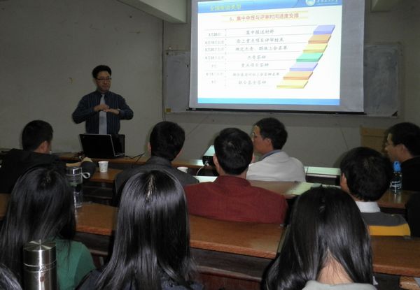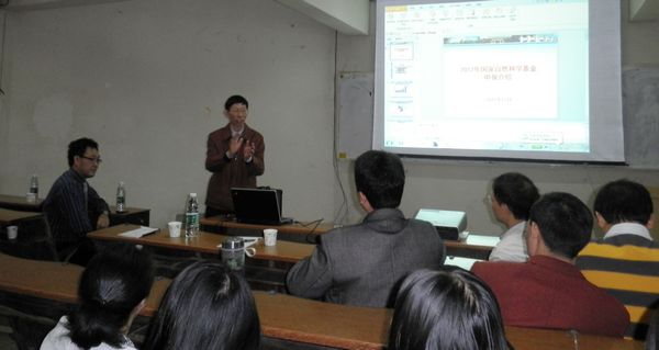 接着,彭教授开始讲解申报国家自然科学基金的相关事项。他从国家基金申报情况及项目类型、今年政策调整与变化、申报基金的经验总结等方面进行了讲解。他介绍了国家自然基金资助的增长趋势现状、经费比例情况,还具体解释了集中申报类型与非集中类型的申报项目。最后他总结了在申报基金方面的经验。他认为要申报基金首先要潜心研究,加强积累,不断地扩大学术的影响;然后要加强后期管理,重视绩效评价,提前介入指南等。此外,他还特别对申请书撰技巧和策略作了详细的介绍,提醒老师们写申请书一定要对学科方向发展现状有充分的了解,要提出有建议性的问题并清楚解决这些问题的思路,注意逻辑关系、创新点以及预期效果的撰写。