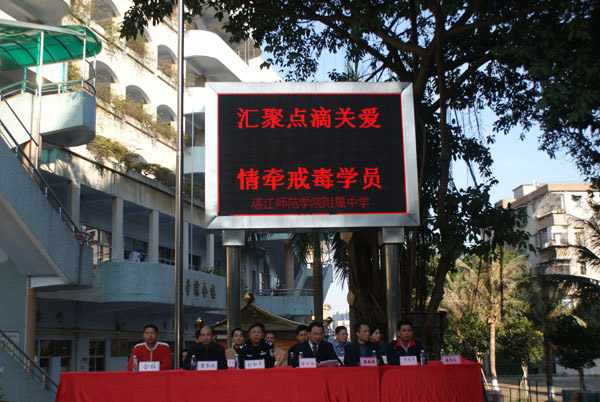 随后,湛江市戒毒劳教所的两位学员代表发言。他们从吸毒的原因、经过、危害、戒毒的过程等方面告诫在场的同学,要以他们为鉴,远离毒品,珍爱生命,报效社会,并希望社会能够接受他们,给予“重生”的他们回报社会的机会。