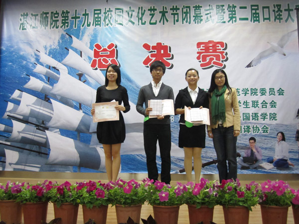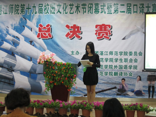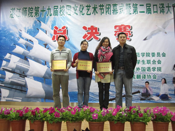 本次活动由两个环节组成。第一环节是第二届口译大赛总决赛,第二环节湛江师院第十九届校园文化艺术节闭幕式颁奖。六位选手流利的英语口语和准确的翻译博得现场阵阵掌声和欢呼。6位选手听译完毕后,评委马晓梅副教授选手的精彩表现作重要点评,并对现场翻译爱好者提出进入口译学习前的英语学习内容,期望明年的翻译之星,并鼓励大家继续坚持继续努力。本次大赛一等奖的得主是来自09英教6班的黄梦茵同学,比赛相应产生两个二等奖和三个三等奖。第一环节第二届口译大赛总决赛结束,接着进入第二环节,第十九届校园文化艺术节颁奖仪式。此次校园文化艺术节诞生了十大文艺骨干和三个优秀组织奖,十大文艺骨干由冯佩芬等同学获得,由校团委李发武副书记颁奖,三个优秀组织奖由音乐学院、化学院和人文学院获得,由校团委李粤书记颁奖。