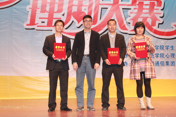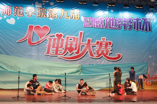 2日晚上,灯光的亮起舞台的同时,拉开了心理剧总决赛的序幕。比赛期间各个剧组使出浑身解数,一争高下,他们跌宕起伏的剧情也是紧紧地扣住现场观众的心弦。教科院的作品《华丽的转变》贴近大学生生活,展现了主角成长中的转变,突出了主角心理路程的转变,最后以高分91分拿下了比赛的一等奖。而法政学院晴天话剧队的《花开时的泪》则以90分紧接其次,荣获了二等奖。该剧紧扣比赛的主题,把主人公由于性知识不足而引发了各类问题时的矛盾心理展现得淋漓尽致,亦引起现场观众对爱与性的深思。同得二等奖的还有校话剧队带来的《情》,其演员的逼真演技,把主人公因爱自杀和女主人公回心转意的剧情深深地刻画出来,还运用了出其不意的特技特效为整一个剧目锦上添花,使得现场爆发出阵阵的掌声。此外,外语院的《将爱情进行到底》以异地恋为主题,唯美的剧情,符合大学生对恋爱的构想,其中穿插的女主角的宿友遭遇被为性而爱的男朋友抛弃这一剧情,告诫了大学生们要理智地谈恋爱。同属外语院的《向左走,向右走》一剧,以错爱为主题,通过女主人公的两段恋情,演员们神态丰富,演技精湛,剧情的最后是以女主人公向左走和男主人公向右走错过而落幕,更是达到了以无声胜有声的效果。与此同时,由化学院熠星文工团话剧队带来的《谁动了我们的爱情》,以独特的演绎方式,带动台下观众的情绪,剧中的两个爱情故事,真实地再现了当代年轻人恋爱过程中的复杂心理。外语院的《将爱情进行到底》、《向左走,向右走》和化学院的《谁动了我们的爱情》三个剧目则并获比赛的三等奖。
