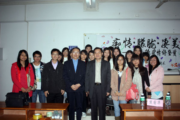 湛师新闻网12月4日讯 昨晚,海外华文华文研究所所长熊国华教授在弘雷楼705主讲了一场题为“痴情·朦胧·凄美”的李商隐爱情诗歌鉴赏讲座。人文学院熊家良院长、辅导员张家波老师出席了本次讲座。
