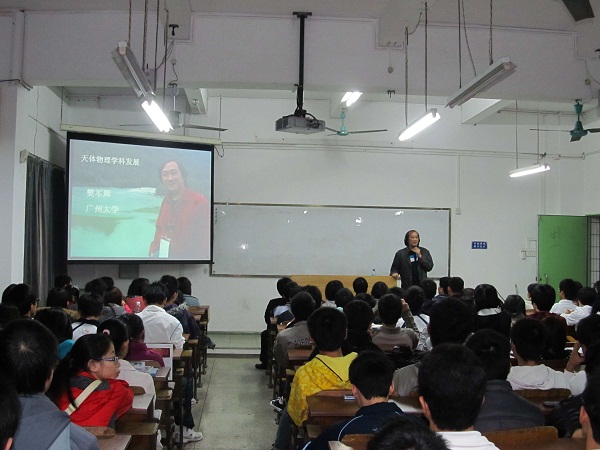 报告会伊始,樊军辉教授表示了对物理学院教学、科研工作的赞赏以及肯定,并希望两校之间能加强合作,在学术方面有更好的交流。接着,樊教授以生动浅易的语言,给大家介绍了天文学这一科学领域的概况与发展情况。讲话中,樊教授引经据典,现场解说了许多关于在天文学领域上做出突出贡献的科学研究者的事迹,并通过电脑屏幕纷纷展示在同学们的眼前。樊教授还借着回顾2005国际物理年和2009世界天文年,呼吁大家在纪念爱因斯坦、伽利略等伟大科学家的同时,也要重视天文学、在学习专业之余,可以加强对该科学领域的学习。紧接着,樊教授也对我国天文学的发展史作了概述,他表示,随着我国经济的发展,国内对天文科学的发展也将日益重视,这从国家对天文学的资助,对大型仪器的建设与规划中都可看出。最后,樊教授热情地给大家介绍了广州大学物理与电子工程学院,并针对天文学这一领域,对其四个发展方向,学术队伍,科研成果,人才培养与工作条件等方面作了较详尽的介绍,同时欢迎物理学院学子报考广州大学天文学研究生方向。听了樊教授的演讲,在场同学大受鼓舞,对天文学产生了浓厚的兴趣。