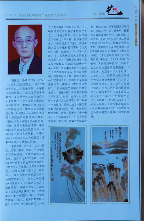 湛师新闻网12月2日讯 《中国艺魂》杂志以我校退休教授萧佩钦老师为其建党90周年专刊封面人物,并以萧老师两幅书画作品为封底,于两版介绍了其事迹并刊登其七幅作品。