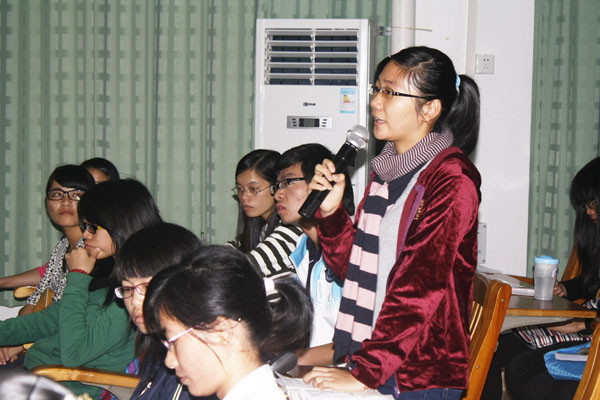 然后,刘博士还讲了“当代大师缺失原因何在”,并将其原因归结为学术屈从于政治,缺乏思想自由、家学失落、大学体制问题。最后,刘博士还“呼唤大师”,表达自己对现今出现超越大师的期盼。在互动环节,同学们反应十分活跃,积极与博士讨论问题。