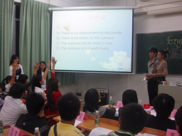 大赛共有三个环节,一是才艺表演,二是耳听八方,三是口头作文,四是心有灵犀。比赛首先由4支参赛队伍逐个进行炫彩青春才艺表演。各团队各展其艺,为观众献上精彩的表演,现场掌声不断。在耳听八方环节,选手们以抢答的形式回答现场播放的四六级听力题目。参赛队员们敏锐的听觉和敏捷的反应能力赢得了场下阵阵掌声。口头作文环节中,选手们以其流利的英语为观众献上一场精彩的演讲。最后一个环节为猜词表演,“你描述,我猜词”的“心有灵犀”猜词比赛把活动推向高潮。