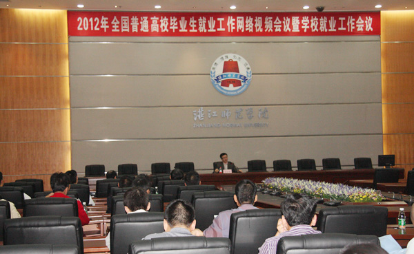 湛师新闻网11月22日讯 昨天下午,2012年全国普通高校毕业生就业工作网络视频会议暨学校毕业生就业工作会议在学校国际会议厅举行。校领导李江凌副院长,各二级学院(含基础教育学院)党政一把手、分管就业工作负责人,招生与就业处全体人员、全体辅导员出席了会议。