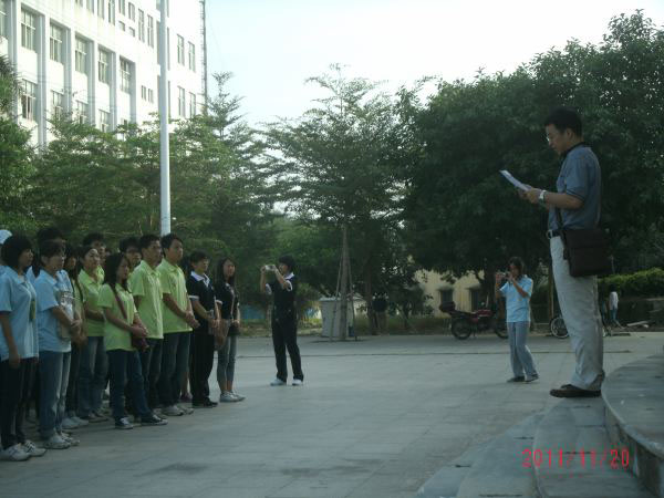 湛师新闻网11月22日讯 20日早,在我校共青团物理科学与技术学院委员会、机电工程系有关领导、老师的直接指导下,在湛江市机电学校、湛江市骏腾公司等单位的大力支持下,由物理学院2010级机电工程系机电班团支部、数控班团支部和汽本班三大团支部联合举办的“纵横职场,魅力机电”精品团日活动在我校雷阳广场隆重举行开幕式。出席本次活动的有物理学院机电工程系主任弓满锋老师、该院辅导员郭莉敏老师和2010级机电工程系学生。