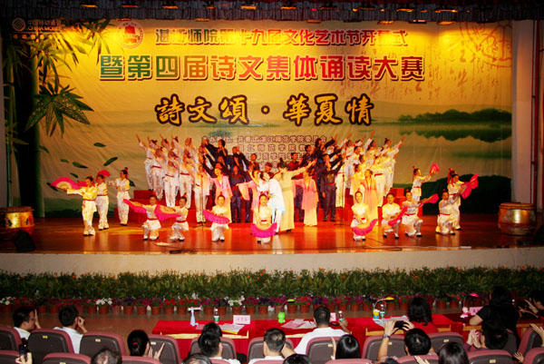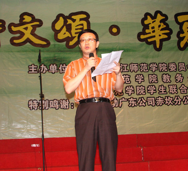 湛师新闻网11月21日讯 11月17日晚,我校第十九届文化艺术节开幕式暨第四届诗文集体朗读大赛在音乐厅隆重举行。学校李江凌副院长,教务处程可拉处长、党委宣传部陈恕平部长、校团委李粤书记、人文学院党委谢应明书记以及部分二级学院党委副书记等领导老师出席了本次大赛,校普通话测试站副站长、国家级普通话水平测试员林小泉,湛江市国家级普通话测试员康文利,学报编辑部编审、省级普通话水平测试员阎志芬和学报编辑部主任宋立民应邀担任大赛评委,此外,正在我校进行工作交流的团江门市江海区委、妇联的领导干部也一同观看了大赛盛况。
