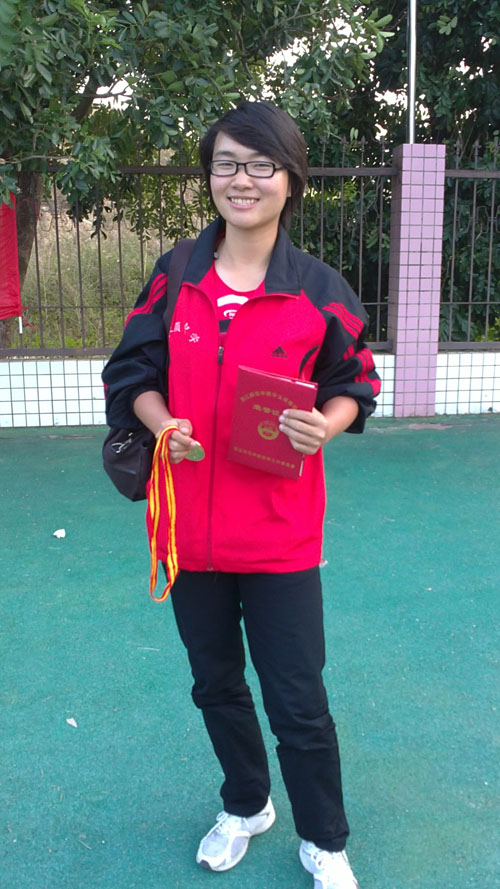 眼前这位女孩给人一种轻松,稳重,不慌不忙,镇定的感觉,似乎这场比赛对她来说是件轻而易举的事。只是,今天她没能成功打破记录。但乐观自信的凤英说“我明年应该可以破的”,此时的她脸上洋溢着自信的微笑。而在这前一天,她还参加了女子铅球比赛,虽然得了第三名,但她很高兴地说到,这次比赛感觉太好了,有很浓烈的竞争气氛,很有挑战性。