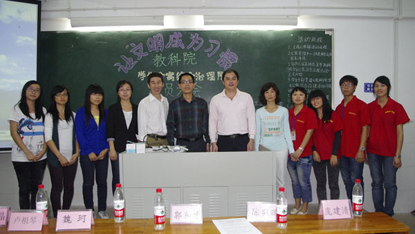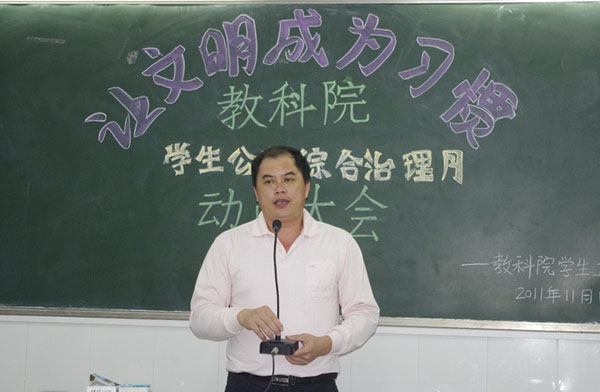 湛师新闻网11月15日讯 古语云:“一屋不扫,何以扫天下。” 昨晚,教科院于燕雷楼604室举办以“让文明成为习惯”为主题的学生公寓综合治理月动员大会。我校公寓管理中心陈奕鹏主任,楼委办公室庞建清老师、教科院党委郭和才副书记、教科院辅导员魏柯老师及辅导员贾晶老师出席本次大会。