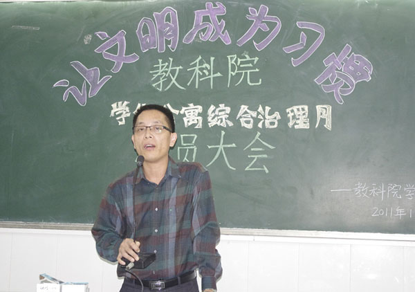 紧接着,党委郭和才副书记对宿舍管理工作提出建议,他表示:“希望各舍长干部要以“纪律、卫生、文明、和谐”四为一体的新标准完成本次公寓治理月的任务,努力将教科院的宿舍苑区工作提升到新的高度。”并要求同学们自觉管理自己的日常生活,严于律己,以养成良好的生活习惯。