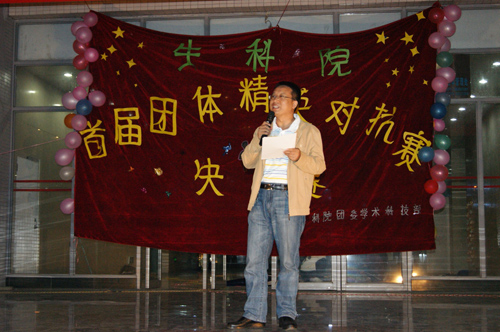 湛师新闻网11月14日讯 昨晚,由生科院团委学术科技部主办的首届团体精英对抗赛决赛在雷阳楼A栋门前举行,出席本次大赛的有生科院副院长刘金祥教授、刘晩苟博士、陈燕副教授。