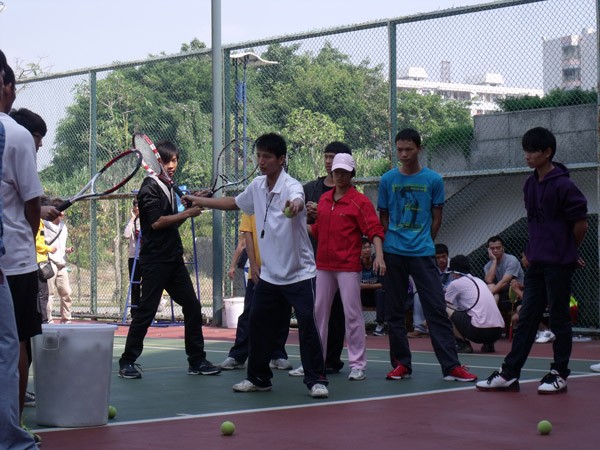 活动开始,同学们首先在雷阳区体育训练馆门前集中。随后,便分为网球、体育舞蹈、健美操三个部分作为课堂内容分别在雷阳区网球场、大学生活动中心四楼以及体育训练馆健美操房进行。在开展这次模拟课堂的过程中,09体教4班同学扮演“小老师”的角色,给11体教4班的同学上课。现场气氛活跃,而11级的同学也认真地向师兄师姐学习。