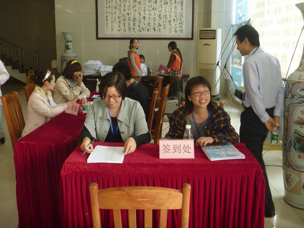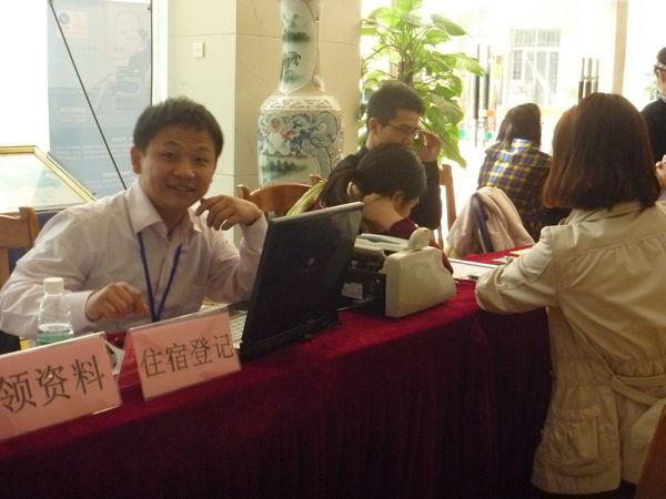 上午八点,学校东门的志愿者已开始热情的接待前来的领导、专家以及参赛选手,帮助他们在园府酒店办理相关入住手续。