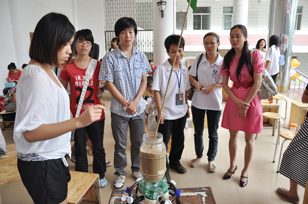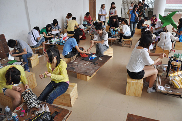 湛师新闻网11月7日讯 为了提倡低碳环保,提高同学们的创新能力。昨天上午,由美术学院学生会女生部、权益部主办的“要低碳不要低叹”为主题的第二届低碳手工制作大赛在咏雷楼小舞台前举行。该院实习辅导员李芳老师、学生会主席曲浩以及各二级学院学生干部出席了比赛。