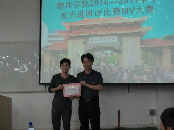 最后,由吴万副书记为获得“标兵班”称号的09物本(2)班颁奖。另外,获得“先进班集体”称号的分别为:10物本(2)班、10科本班、09地理班和09机电班。本次比赛最佳MV制作奖由09数控班获得。