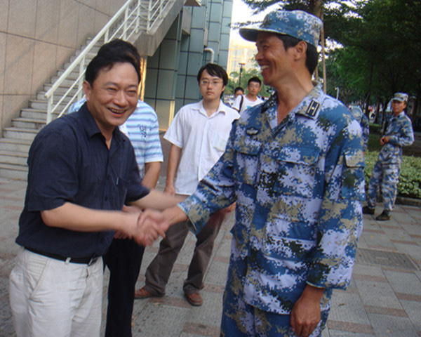 一行领导到各方阵观看了训练情况,并与教官亲切握手表以衷心的谢意,感谢教官对数学院新生的悉心教导,并细心询问教官们军训的进展情况。在对新生表示亲切的问候的同时,李院长强调三点:一要注意身体安全和食品安全,以健康的体魄顺利地完成本次军事训练;二要认真训练,听从教官的指挥,并多与教官交流,向教官学习;三要认真整理内务,养成良好作风。同时,他勉励新生们继续努力,刻苦训练,争取在军训会操中取得优异的成绩,为数科院争光添彩。唐副书记也表示,新生军训需充分发扬吃苦耐劳的精神和团队精神,出色地完成各项军训任务,同时,要把这种不怕苦、不怕累的精神应用到日后的学习生活中来,做到训练十几天受用一辈子。他希望新生通过军训,真正达到提升自我,完善自我的目的。