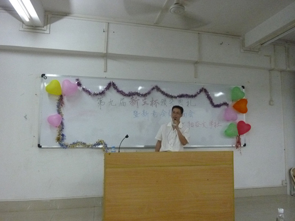 随后冯基聪副书记讲话,他首先对获奖的同学表示祝贺,还深有感触地谈起了文学社的历史,认为太阳谷是文学爱好者的天地,是锻炼写作的一个很好的平台,还表示人文学院在不久后将提供一个网络平台,而这个平台不仅能锻炼同学们的写作能力,而且将为同学们以后找工作积累一定的资本。