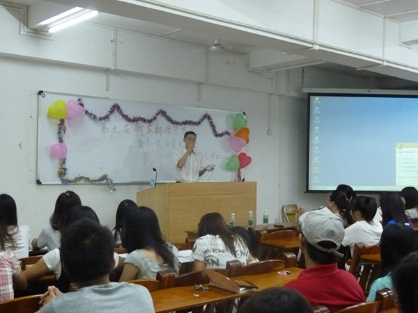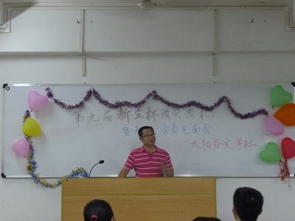在经过了紧锣密鼓的理事招新后,太阳谷的社干们决定趁热打铁,第二天晚上就举行第九届“新生杯”颁奖仪式暨新老会员见面会。颁奖仪式上,谢应明书记、冯基聪副书记、史习斌博士、詹绍姬老师分别为第九届“新生杯”现场作文大赛一、二、三等奖和优秀奖的获得者颁发了荣誉证书和奖品并合影留念。接着史习斌老师点评,他首先肯定了同学们在“新生杯”现场作文大赛中的出色表现,他认为同学们把握题旨非常准确,创作方法非常丰富。史老师称赞新生们的才华,还特意对部分文章作了点评,由此总结出了写作要求真、求深、求准。此外他还对文学的定义作了独特的见解,他认为文学是风花雪月的事,因为它拥有风的自由、花的美艳、雪的冷峻和月的高洁。