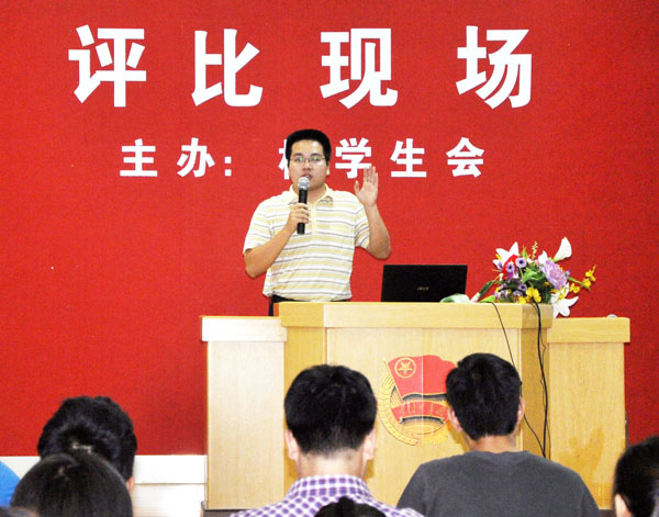 “十佳班长”评选活动主要由书面材料评比和现场解说评比两部分组成。“十佳班长”现场解说环节是由候选人运用PPT、DV短片形式展示自己的工作经验和个人能力,最后总分前十名者当选我校“十佳班长”。