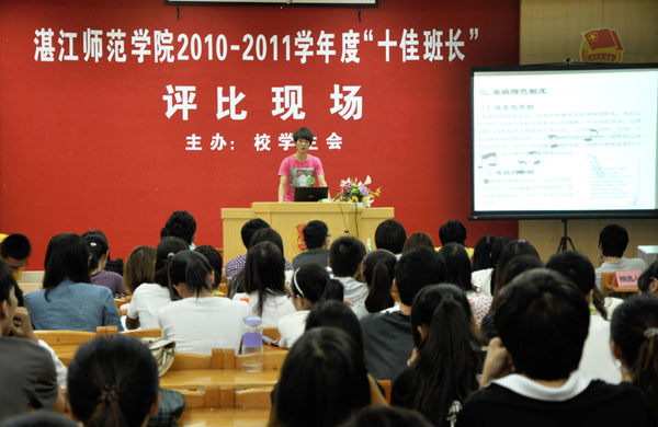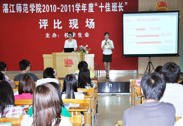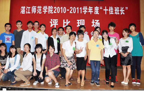 活动最后,主持人宣读了评选结果。获得我校2010--2011学年度“十佳班长”的分别是信息院李靓婧,教科院郑嘉泳,商学院王怡妃,物理院唐伟健,外语院易雅婷,人文院边利利,法政院陆文敏,数科院祈杰莹,体科院梁兵,生科院许建莲。